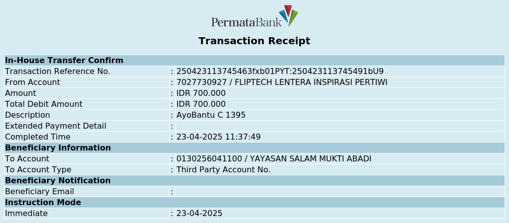 Alhamdulillah berkat dorongan doa dan bantuan dari temen temen semua, para donatur dan orang-orang baik kami telah menyalurakn amanah tersebut kepada de salsa . kami sebagai penerima maanfaat menguacapkan banyak terima kasih atas bantuan yang diberikan, semoga menjadi amal kebaikan untuk sahabat semua dan mudah mudahan para donatur yang diberikan keberkahan dan di panjangkan umurnya. Aamiin