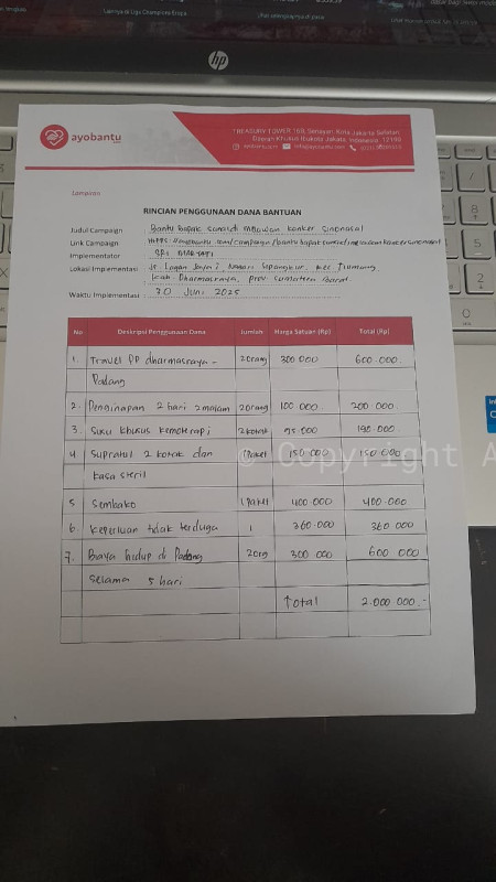 PENGGUNAAN DANA CAMPAIGN "BANTU BAPAK SUNAIDI MELAWAN KANKER SINONASAL" pencairan pada tanggal 30 Juni 2025