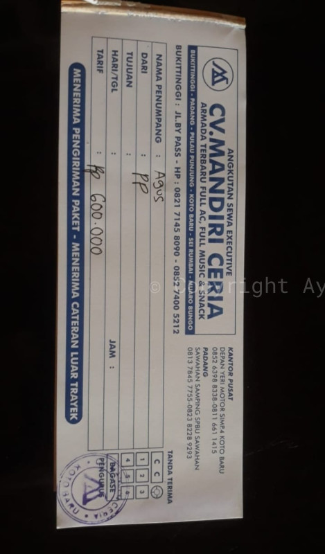 3. Sewa travel untuk dua orang Dharmasraya-Padang (Pulang-Pergi) Rp 600.000.-
